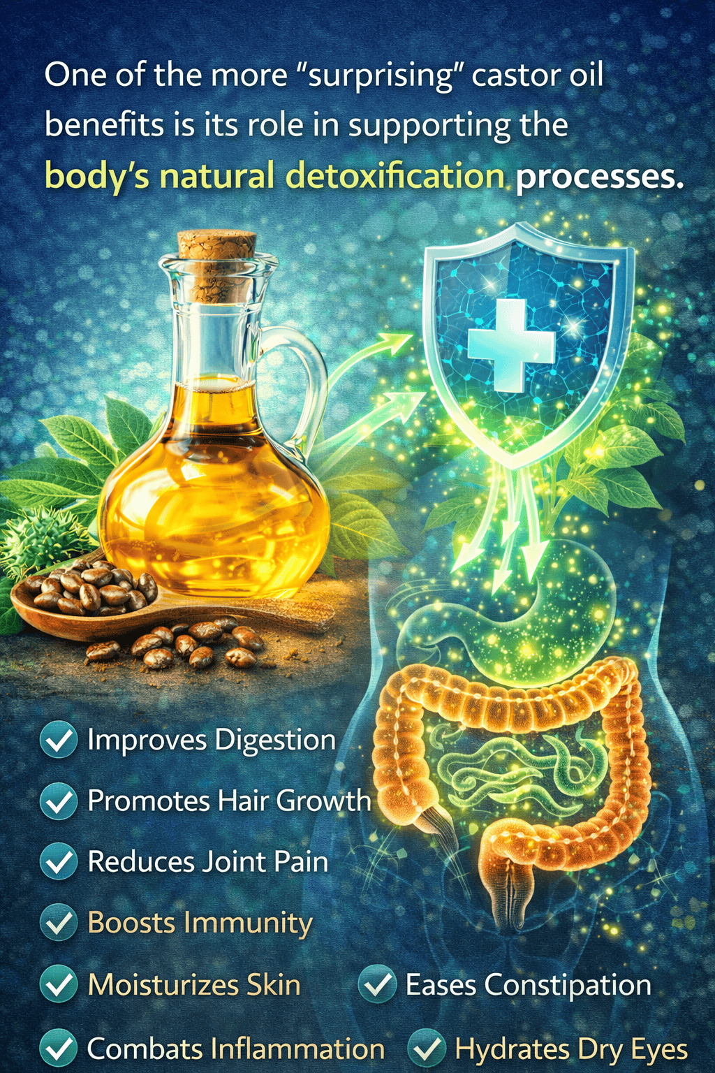 One of the more “surprising” castor oil benefits is its role in supporting the body’s natural detoxification processes.