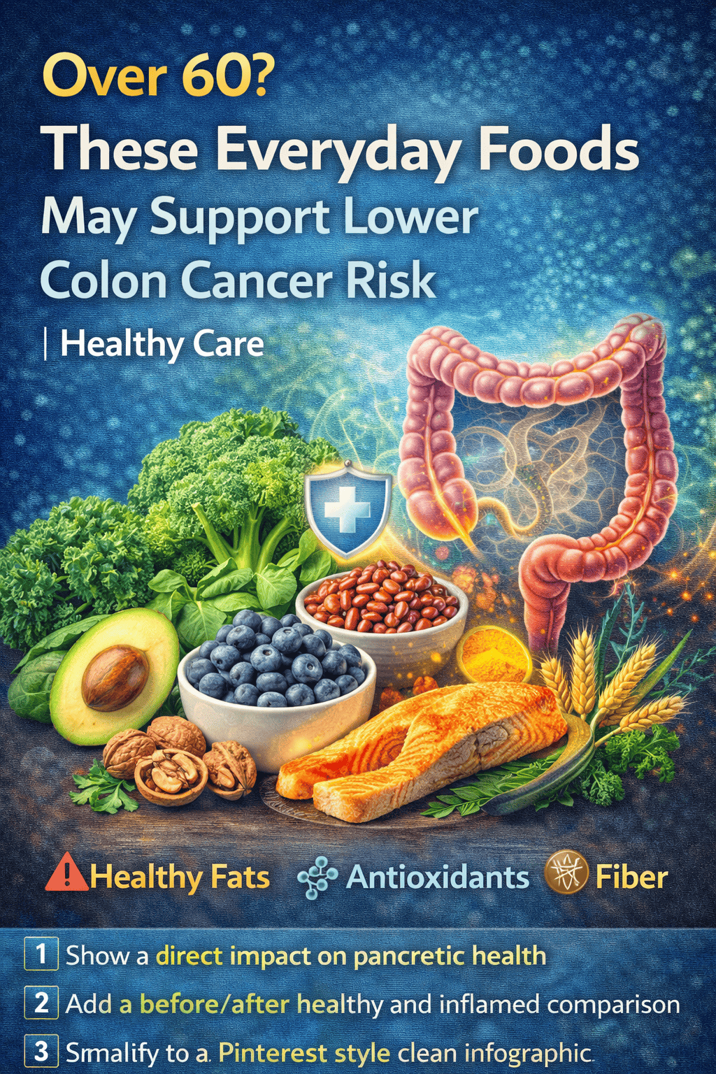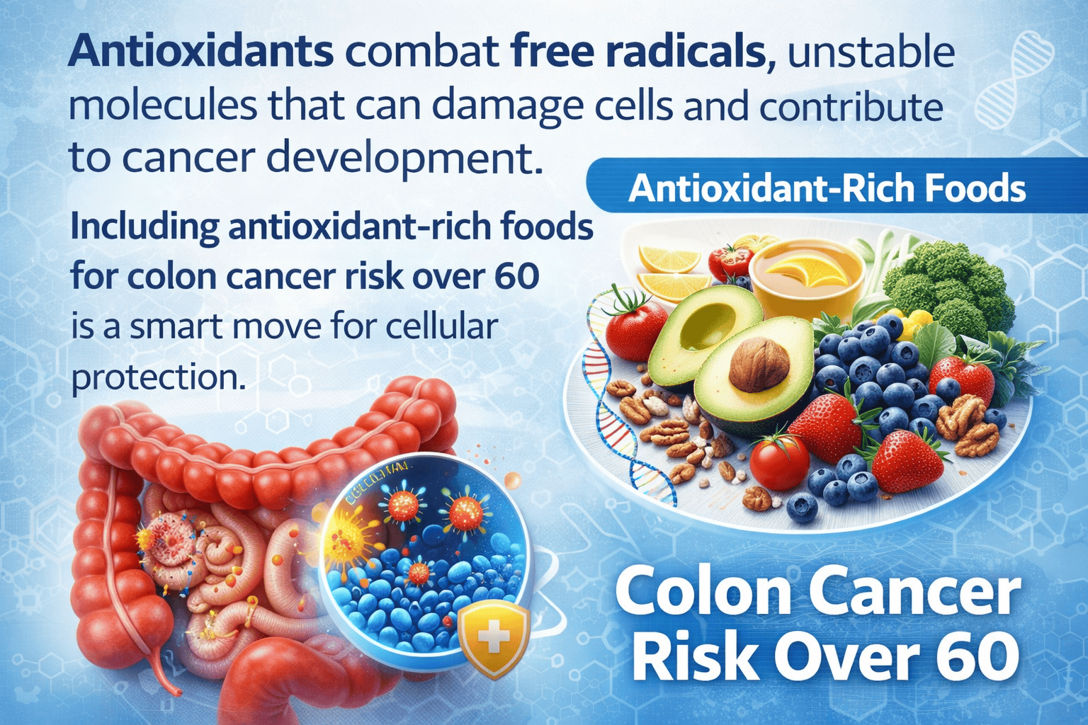 Antioxidants combat free radicals, unstable molecules that can damage cells and contribute to cancer development. Including antioxidant-rich foods for colon cancer risk over 60 is a smart move for cellular protection.